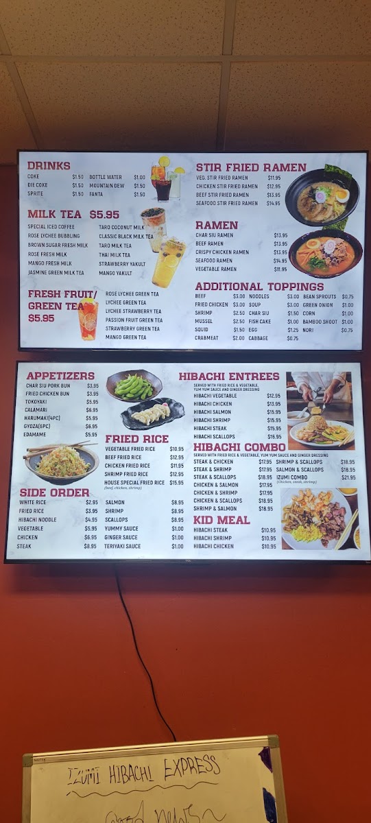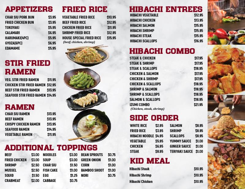 Beyond hibachi, Izumi also offers an array of Japanese ramen with a variety of toppings—the perfect way to customize your meal. With additions like fried chicken, shrimp, and mussel, you can create a bowl that's bursting with flavor. Ramen toppings range in price from US$0.75 to US$3.00, making it an affordable treat any day of the week.